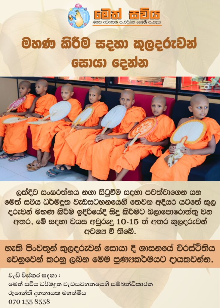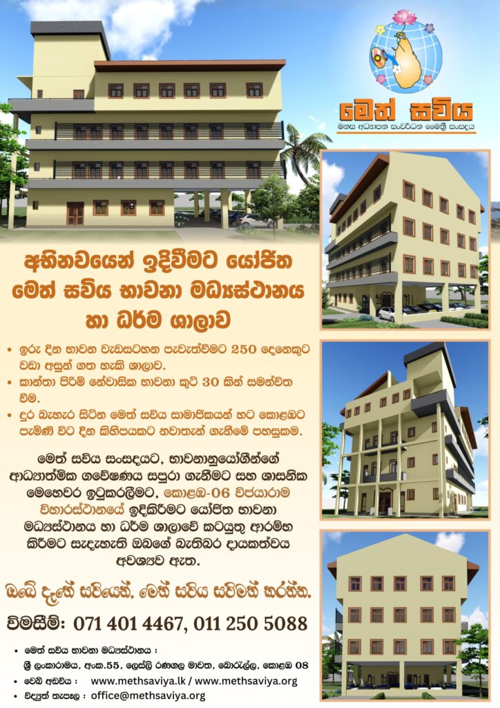 භාවනා කම්මට්ඨානාචාර්ය මෙත්සවිය නිර්මාතෘ මහාචාර්ය චන්දන ජයරත්න මහතා විසින් කරනු ලබයි.